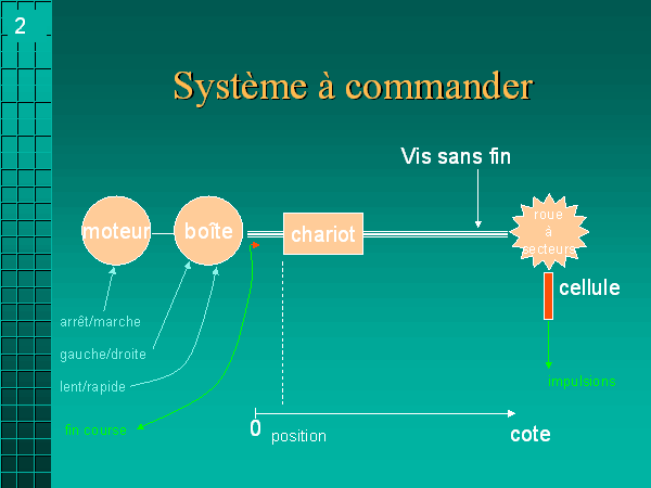 Entraîner le chariot par rotation de la vis-sans-fin, en commandant le moteur et la boîte de vitesse.