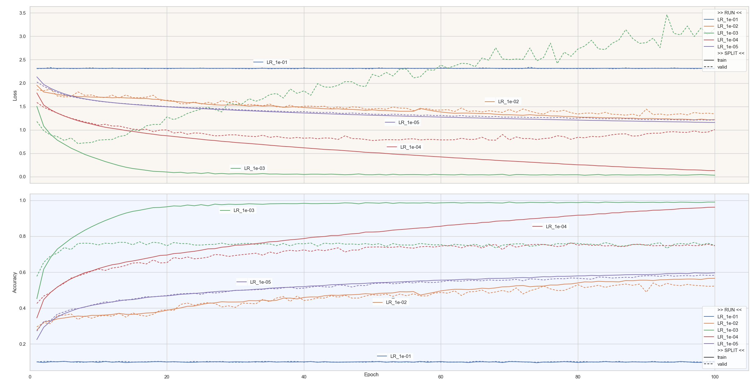 Nous avons choisi des valeurs de LR espacées d’un facteur 10, ce qui représente une plage de recherche très large. La question que nous nous posons est : existe-t-il un LR pour lequel l'Accuracy/validation est vraiment meilleure ? Par curiosité, nous allons tester différentes valeurs autour de 10⁻³ :