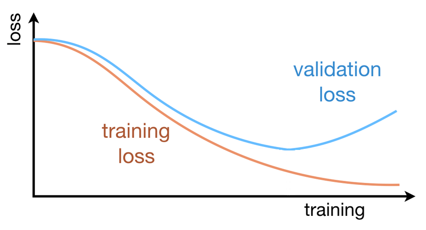 Lorsque la training loss continue de diminuer tandis que la validation loss cesse de décroître ou augmente, on observe un phénomène de surapprentissage : le modèle apprend alors de manière excessive les données d’entraînement, au point de mémoriser les réponses associées aux échantillons. Il est ainsi capable de fournir des réponses très précises sur les données vues durant l’apprentissage, mais généralise mal à de nouveaux échantillons.