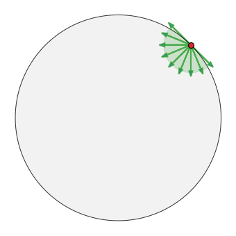 The figure below shows the tangent directions (green arrows) at a point on the boundary of a given set \(\mathcal{C}\). Note that they are always oriented tangentially to \(\mathcal{C}\). For this reason, no tangent direction exists at the exterior or at the interior of \(\mathcal{C}\). They only occur at the boundary of \(\mathcal{C}\), here denonted by \(\partial\mathcal{C}\).