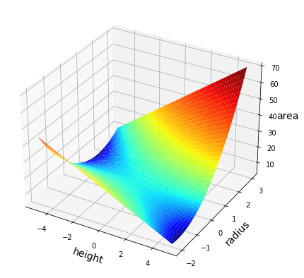 That’s it! You have expressed the quantity you want to optimize in terms of the relevant variables. Now, it is always useful to take a moment to analyze the function you just defined. Let’s plot the objective function to gain a better understanding of the problem. As you can see below, the window’s area grows more quickly by increasing the radius rather than the height, provided that these quantities are non-negative.