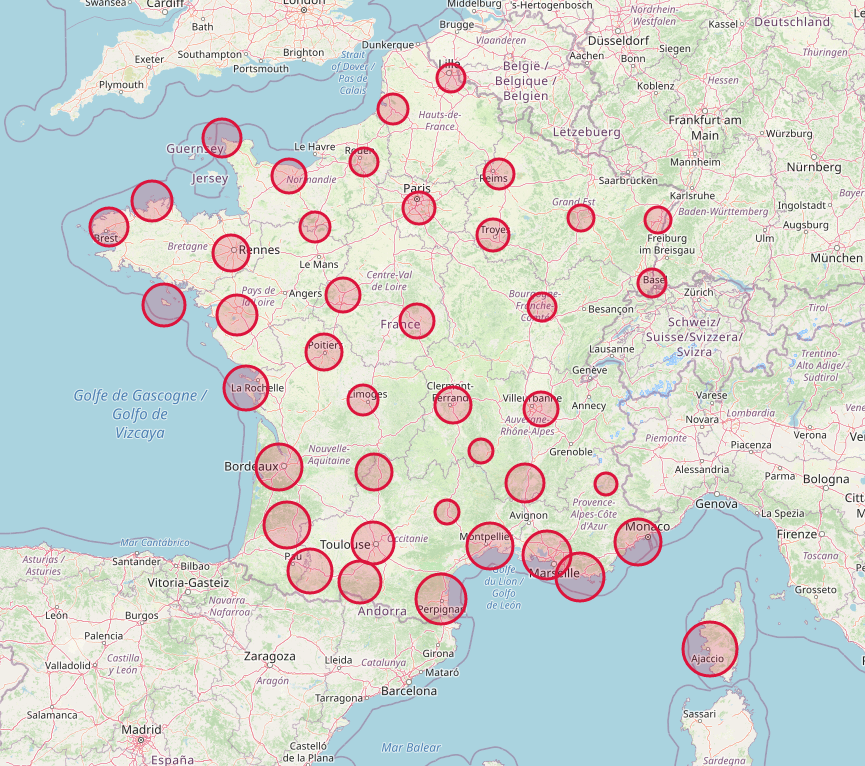 La figure ci dessous est une capture d’écran d’une carte générée avec Folium dont on trouvera la documentation complète ici.