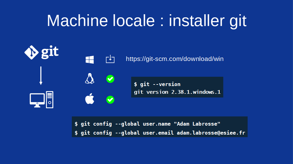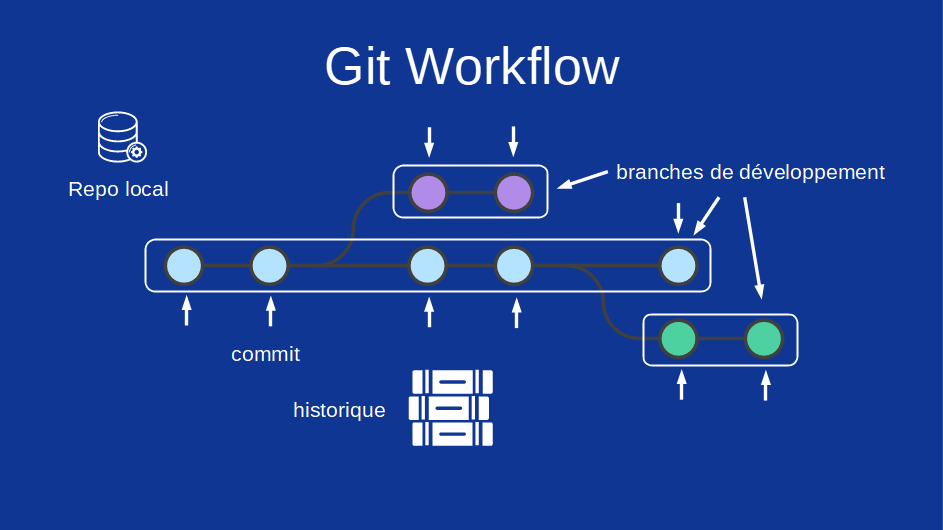 Git est le logiciel de gestion de versions décentralisé le plus utilisé pour le développement informatique. Il permet de synchroniser les contenus d’une (ou plusieurs) machine locale et d’un dépôt distant.