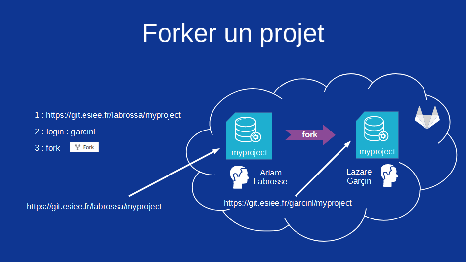 Ici, Lazare Garçin se rend sur la page public du repo myproject de Adam Labrosse, s’identifie, et fork le projet. Il dispose ensuite d’une copie exacte du projet dans son propre espace.