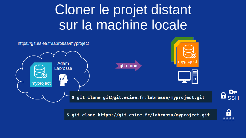 sshnécessite un paramétrage (génération de clés SSH et ajout au compte Gitlab), mais elle est ensuite réalisée automatiquement par comparaison des clés locales et distantes:$ git clone git@git.esiee.fr:labrossa/myproject.git