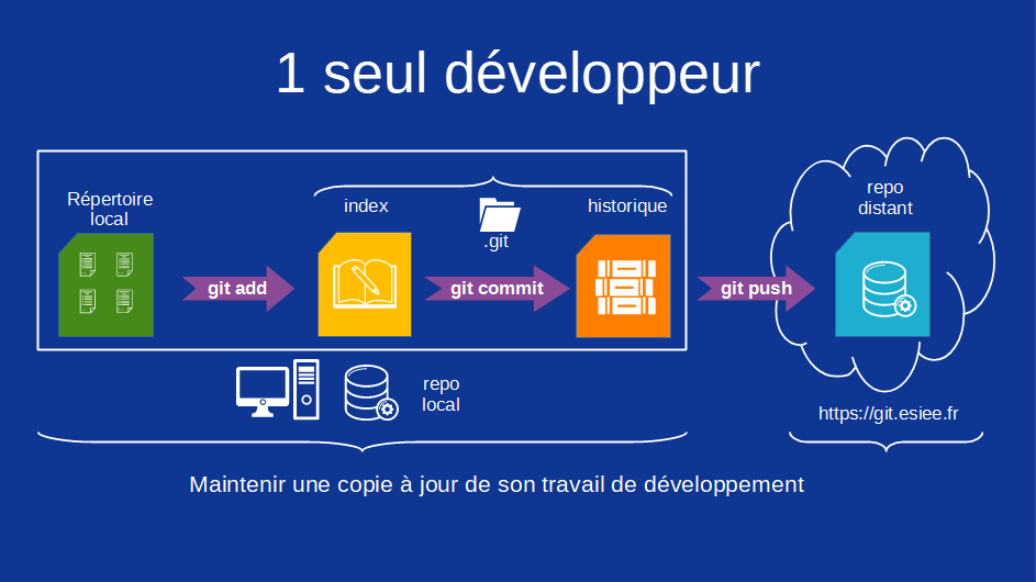 un seul développeur : l’utilisation standard permet d’enregistrer les différentes versions d’un projet et de les synchroniser avec un dépôt distant (Git ESIEE, GitHub, BitBucket, …) ;