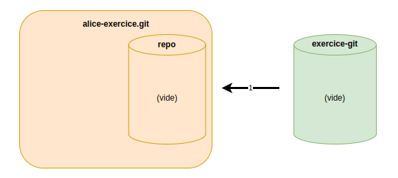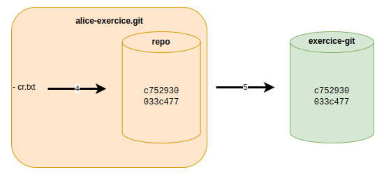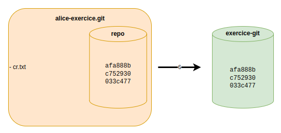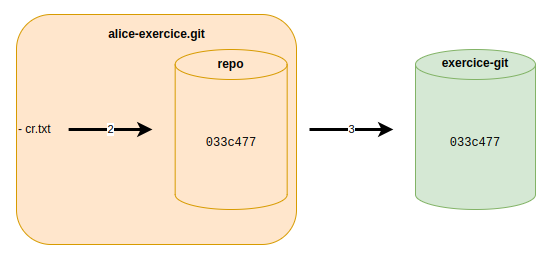Bob a donc récupéré le repo central (augmenté du travail d’Alice) et va pouvoir contribuer à son tour.