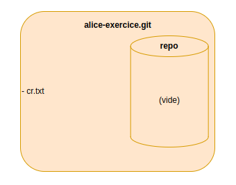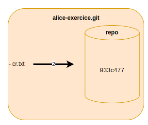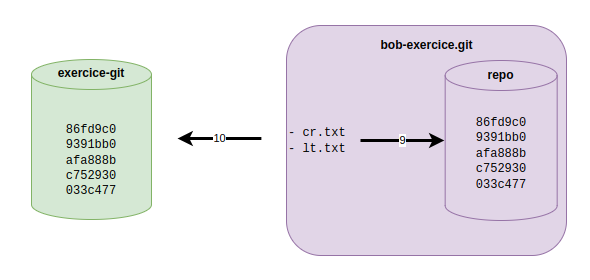 Ici le repo local de Bob est en avance sur le repo central qui ne contient que les contributions d’Alice