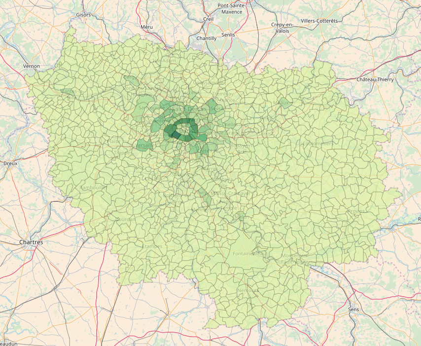 On peut également la rechercher dans une source de données différente. Utiliser ce dataset pour produire une carte choroplèthe de la densité de population des communes d’Ile de France.