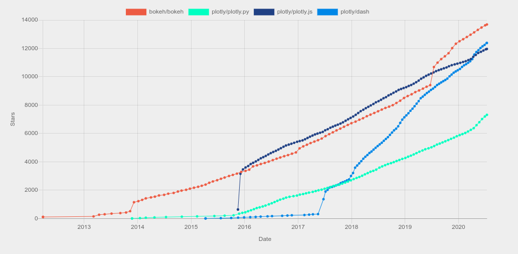 Conformément à ce qui précède, le choix de la communauté se porte actuellement sur plotly/dash comme en témoignent les indicateurs GitHub (il faut sommer les résultats pour l’univers Plotly qui structure sa solution en plusieurs dépôts) :