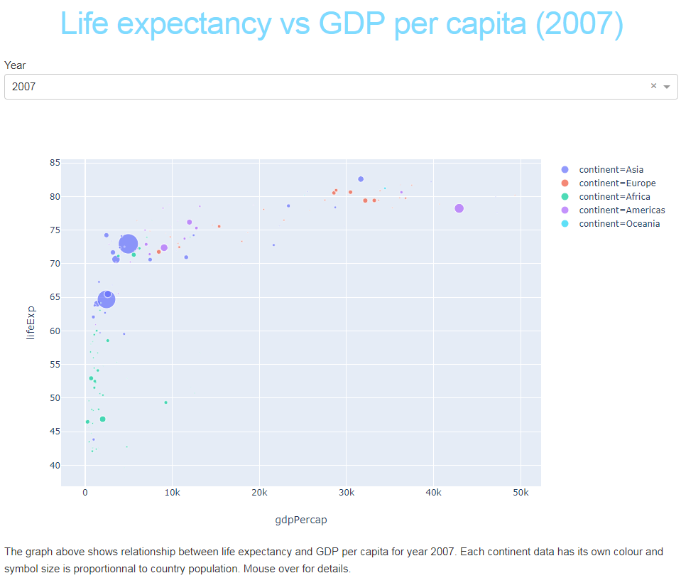 Le dashboard précédent est totalement statique et n’apporte pas de valeur ajoutée par rapport à un graphique Plotly/Plotly Express. Nous allons remédier à ça en ajoutant un widget de sélection de l’année sur le front end.